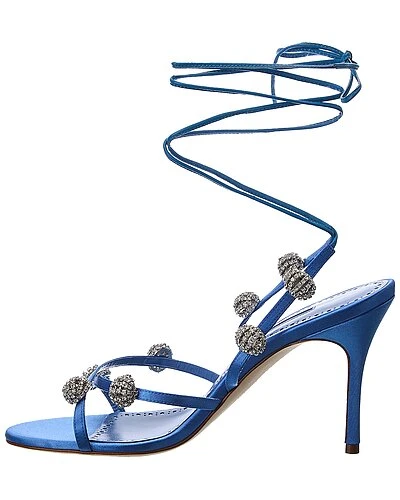 - Elsaka 90 Satin Sandal in blue satin and silver-tone hardware with crystal-embellished bobbles