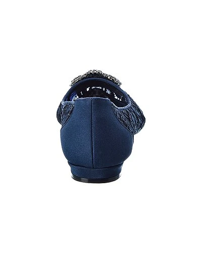 - Hangisi Lace & Satin Flat in navy lace and satin and silver-tone hardware with crystal-embellished buckle