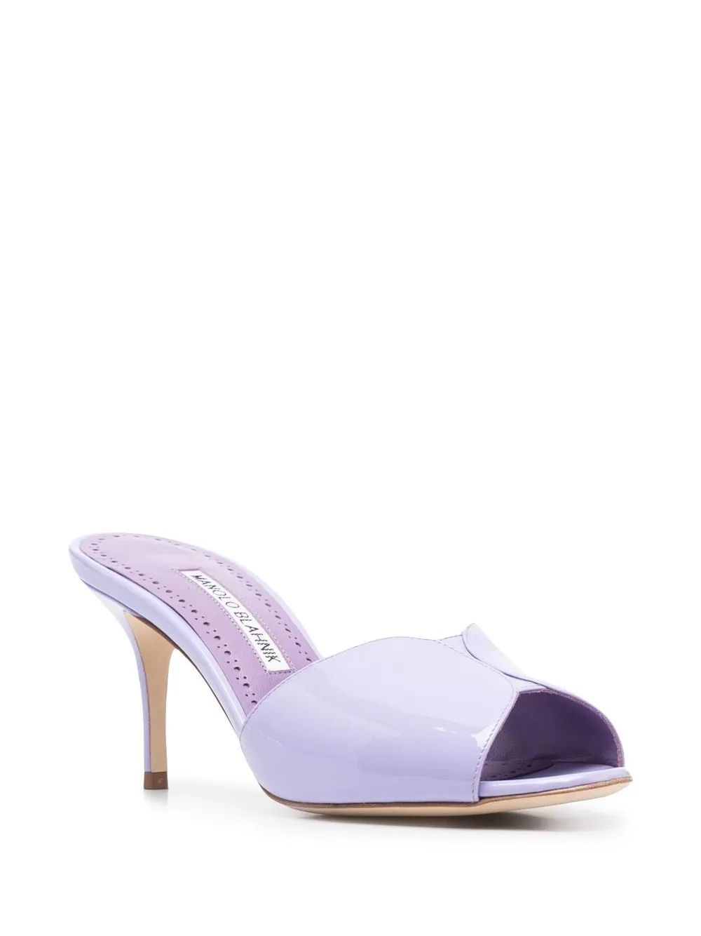 80mm leather mules from MANOLO BLAHNIK featuring lilac purple, calf leather, slip-on style, open toe, open back, branded insole and high stiletto heel.