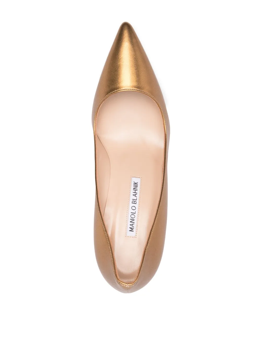 BB 90mm metallic-effect leather pumps from MANOLO BLAHNIK featuring ochre gold, calf leather, metallic effect, pointed toe, slip-on style, stiletto heel, branded leather insole and leather outsole.