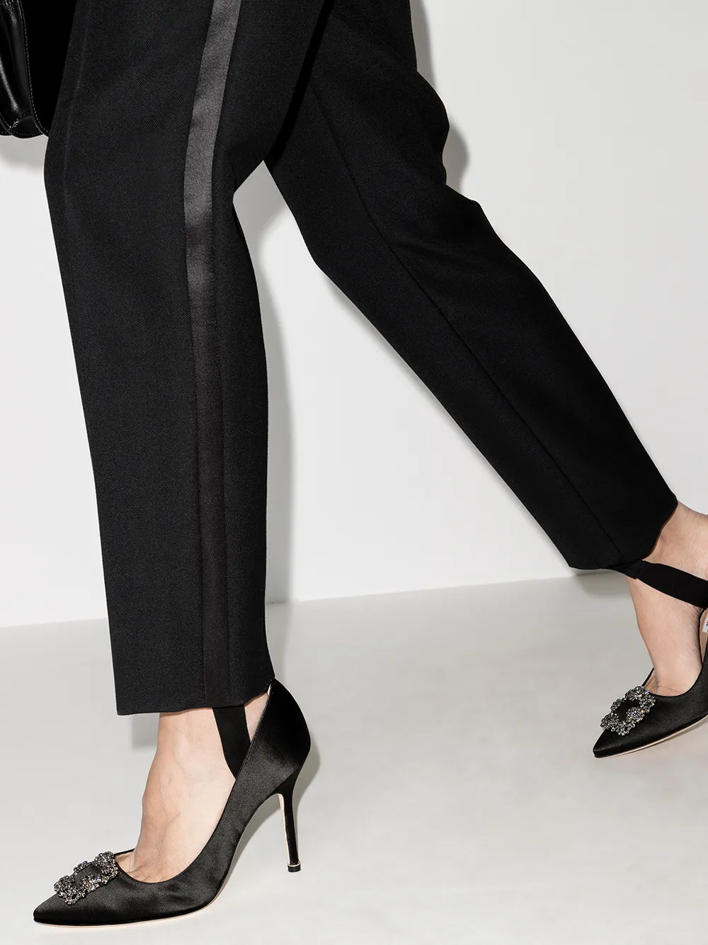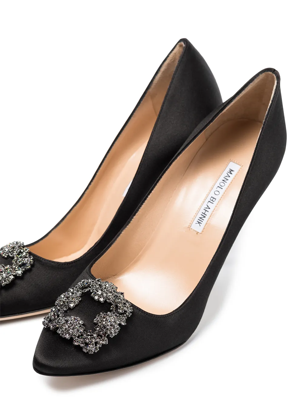 Black satin and leather Black Hangisi Buckle 105 Satin Pumps from Manolo Blahnik featuring a high stiletto heel, a branded insole, an almond toe and a Swarovski crystal buckle.