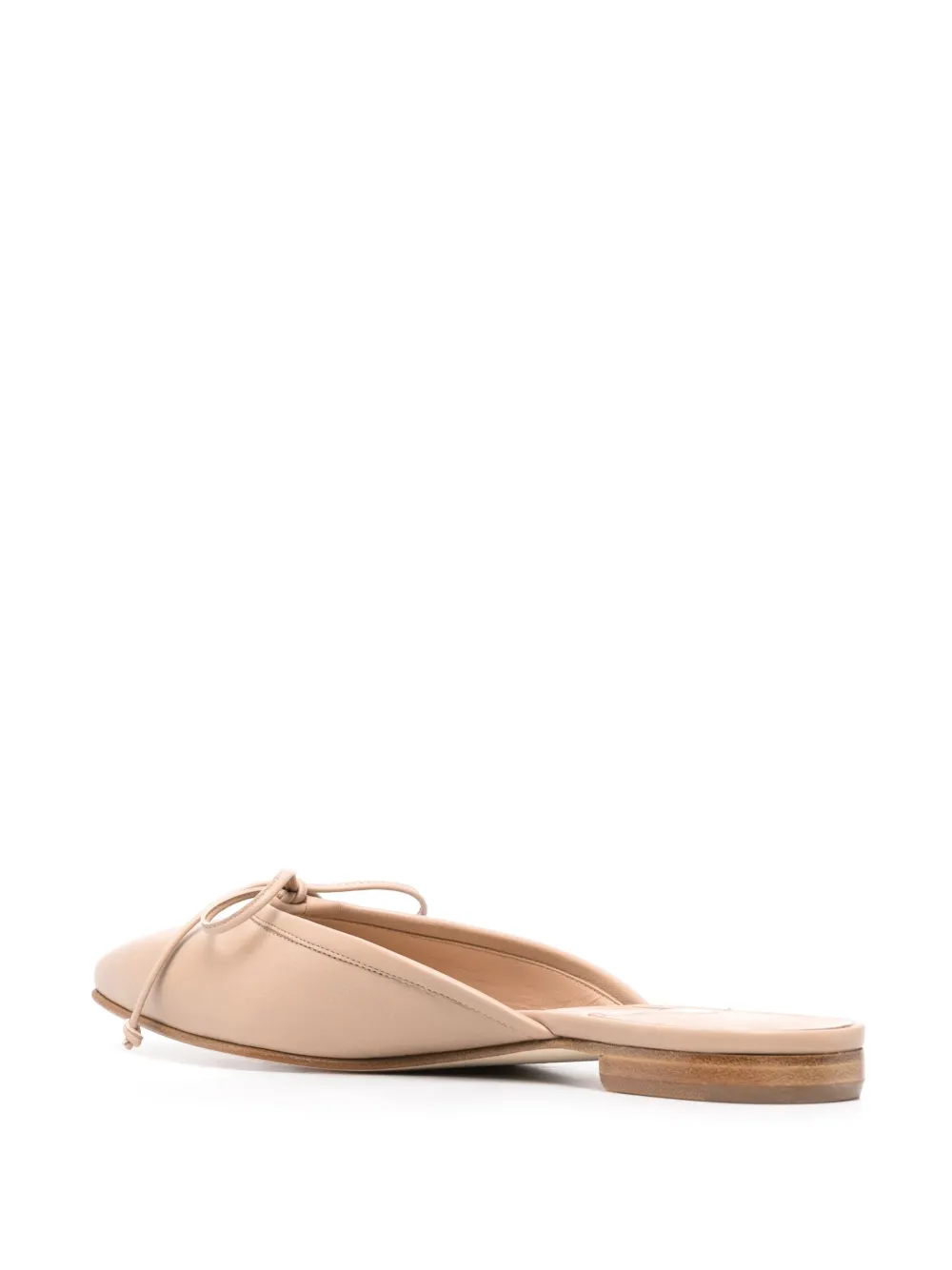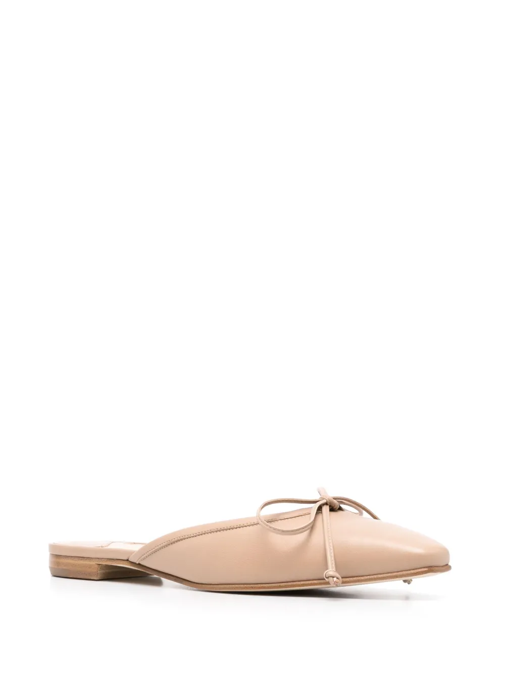 bow-detail flat leather mules from MANOLO BLAHNIK featuring almond beige, calf leather, bow detailing, slip-on style, pointed toe, branded insole and flat sole.