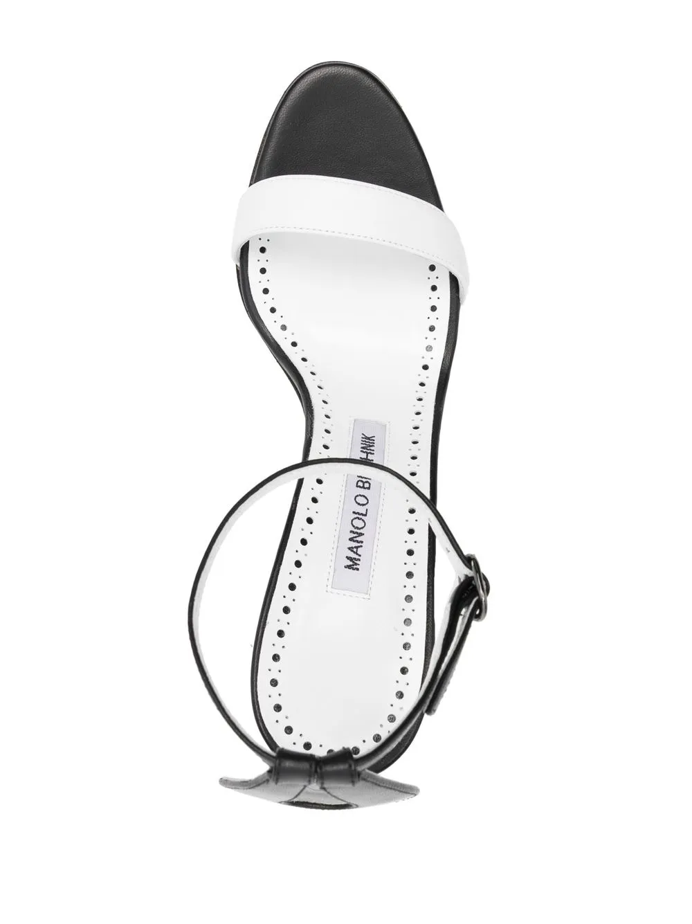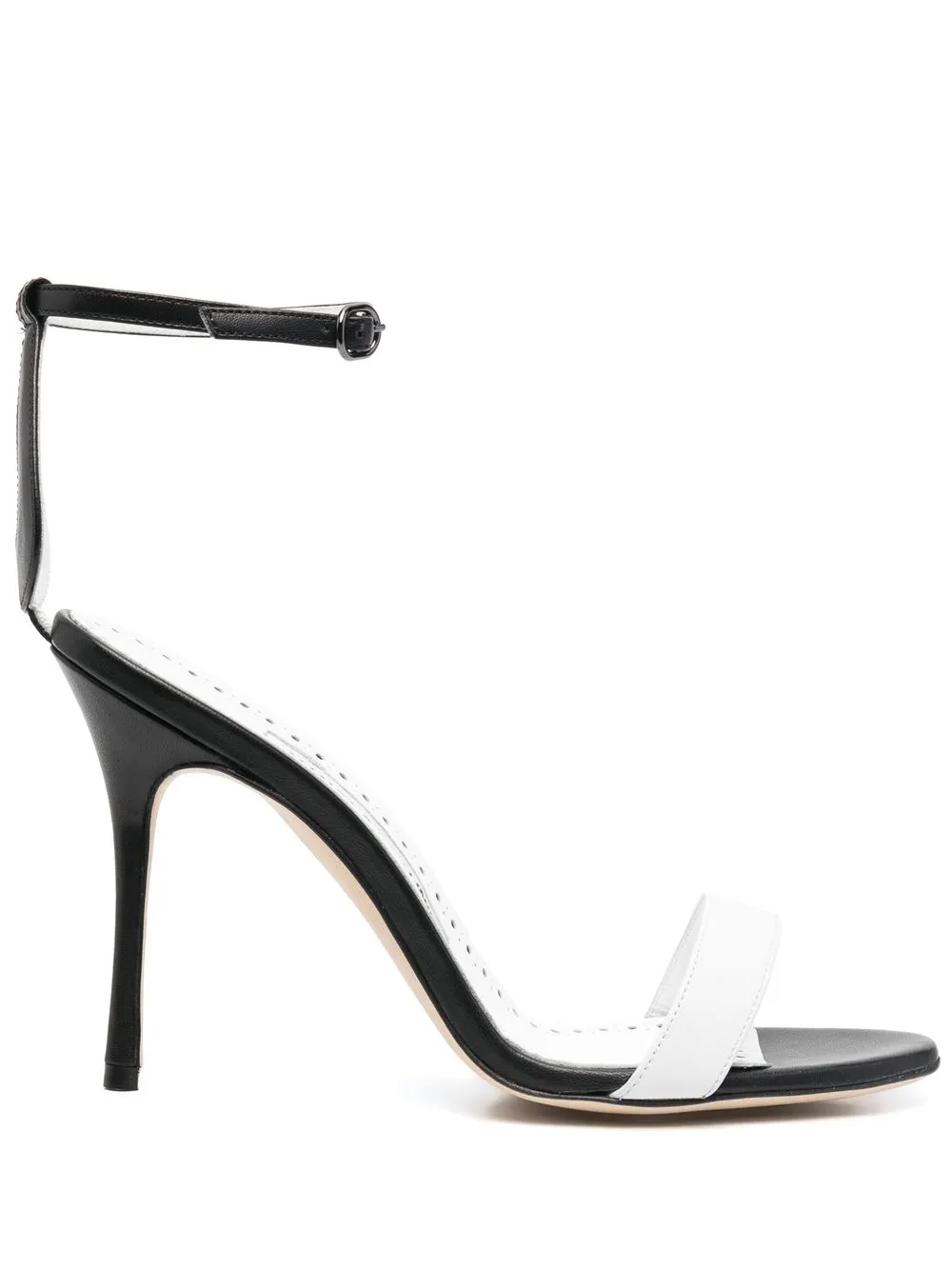 Chatra 105mm heel leather sandals from MANOLO BLAHNIK featuring black/white, nappa leather, leather, cut-out detailing, open toe, buckle-fastening ankle strap, high heel, branded leather insole, leather sole and 105mm heel.