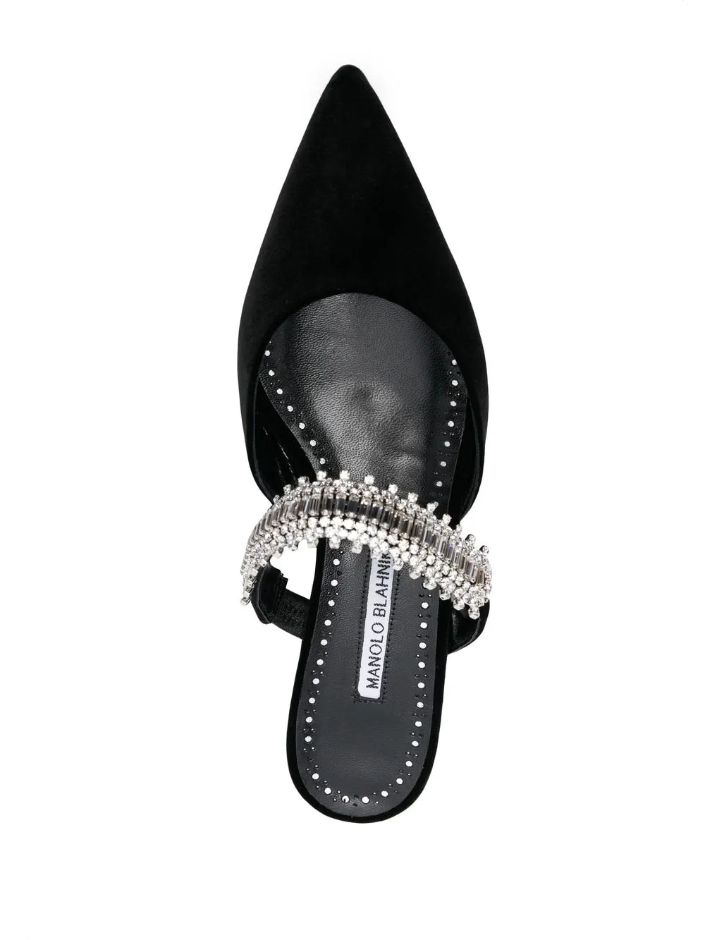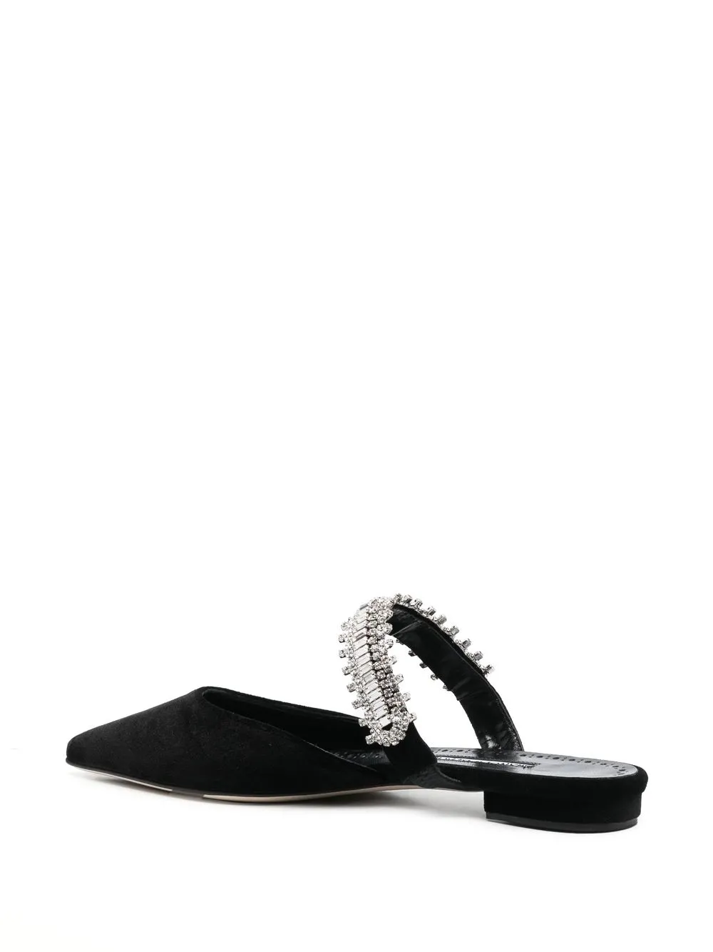 crystal-embellished flat mules from MANOLO BLAHNIK featuring black, crystal embellishment, branded insole, pointed toe, elasticated strap and slip-on style.