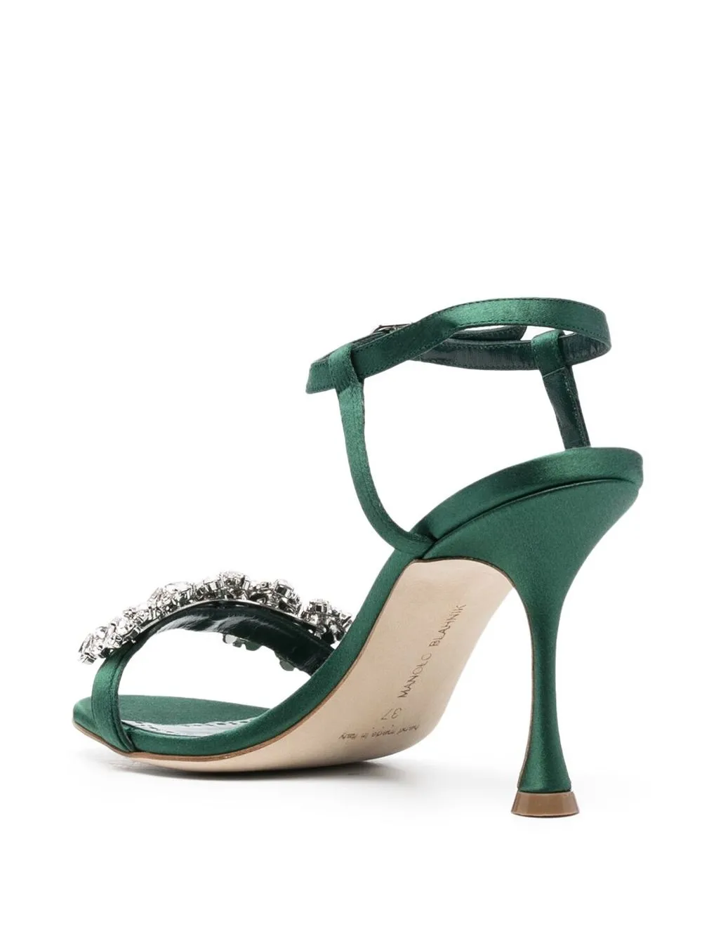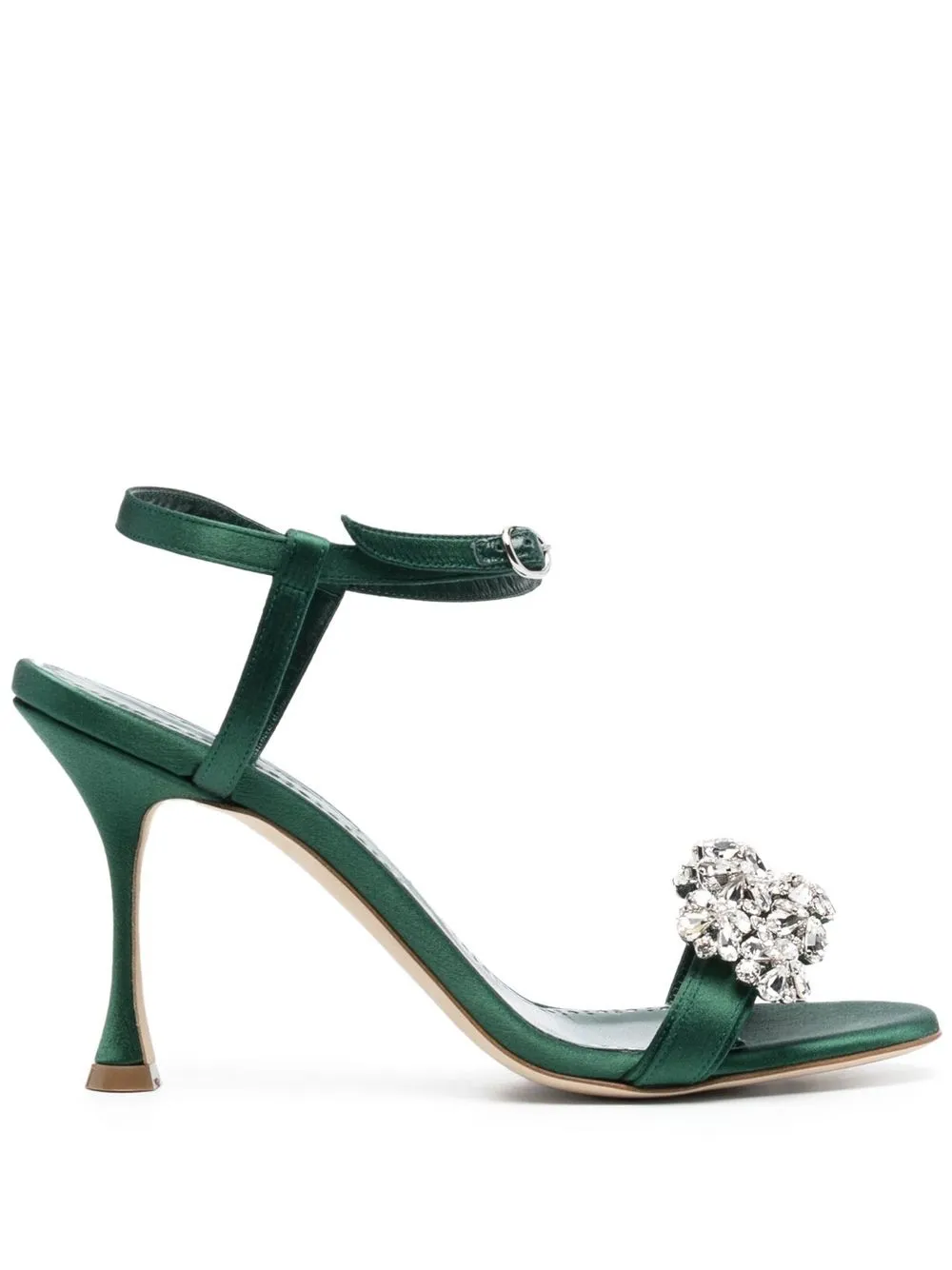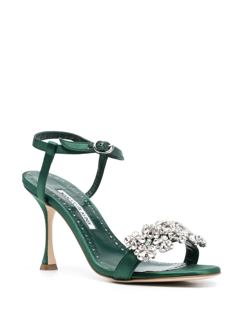 crystal-embellished sandals from MANOLO BLAHNIK featuring dark green, crystal embellishment, strap detailing, almond toe, buckle-fastening ankle strap, branded leather insole and high heel.