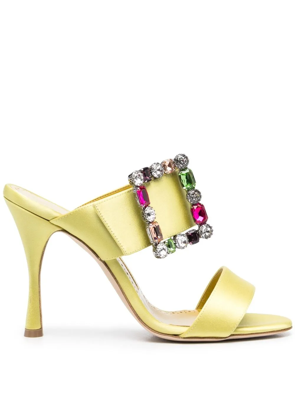 Chartreuse crystal-embellished sandals from MANOLO BLAHNIK featuring crystal embellishment, open toe, branded insole, slip-on style and stiletto heel.