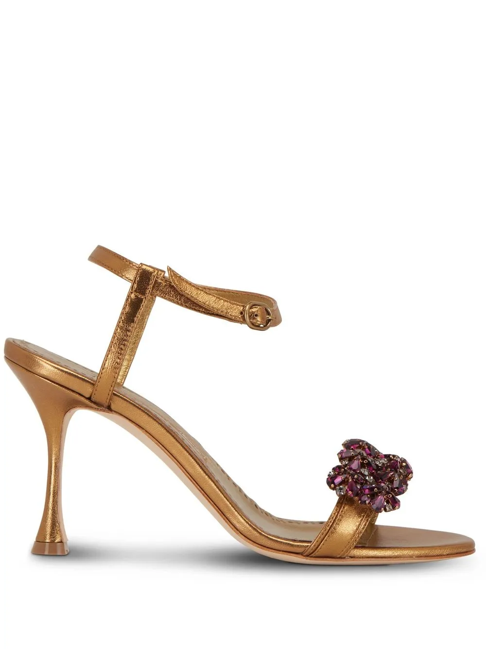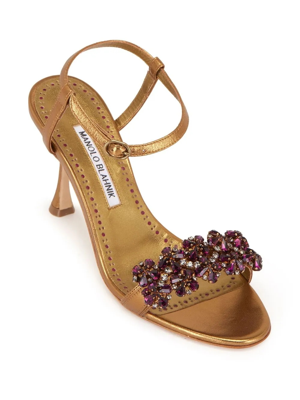 crystal-embellishment heeled sandals from MANOLO BLAHNIK featuring gold-tone, violet purple, leather, metallic finish, crystal embellishment, floral motif, single toe strap, buckle-fastening ankle strap and mid sculpted heel.