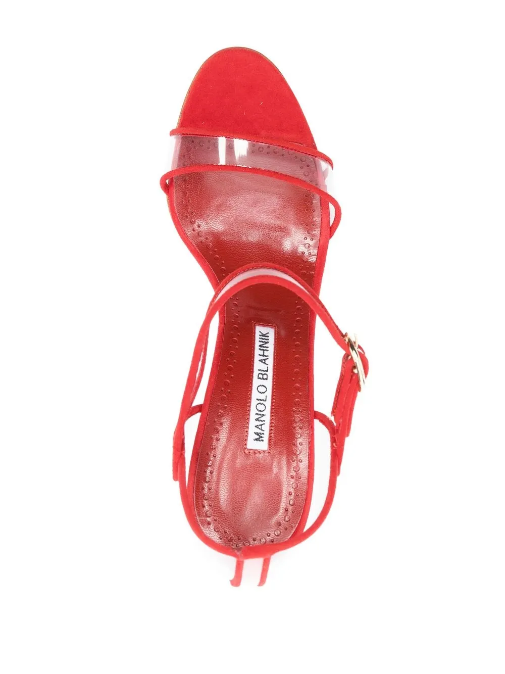 Fersen 105mm suede sandals from MANOLO BLAHNIK featuring red, calf suede, calf leather, suede trim, strap detailing, open toe, buckle-fastening ankle strap, branded leather insole, high stiletto heel and PVC detailling.
