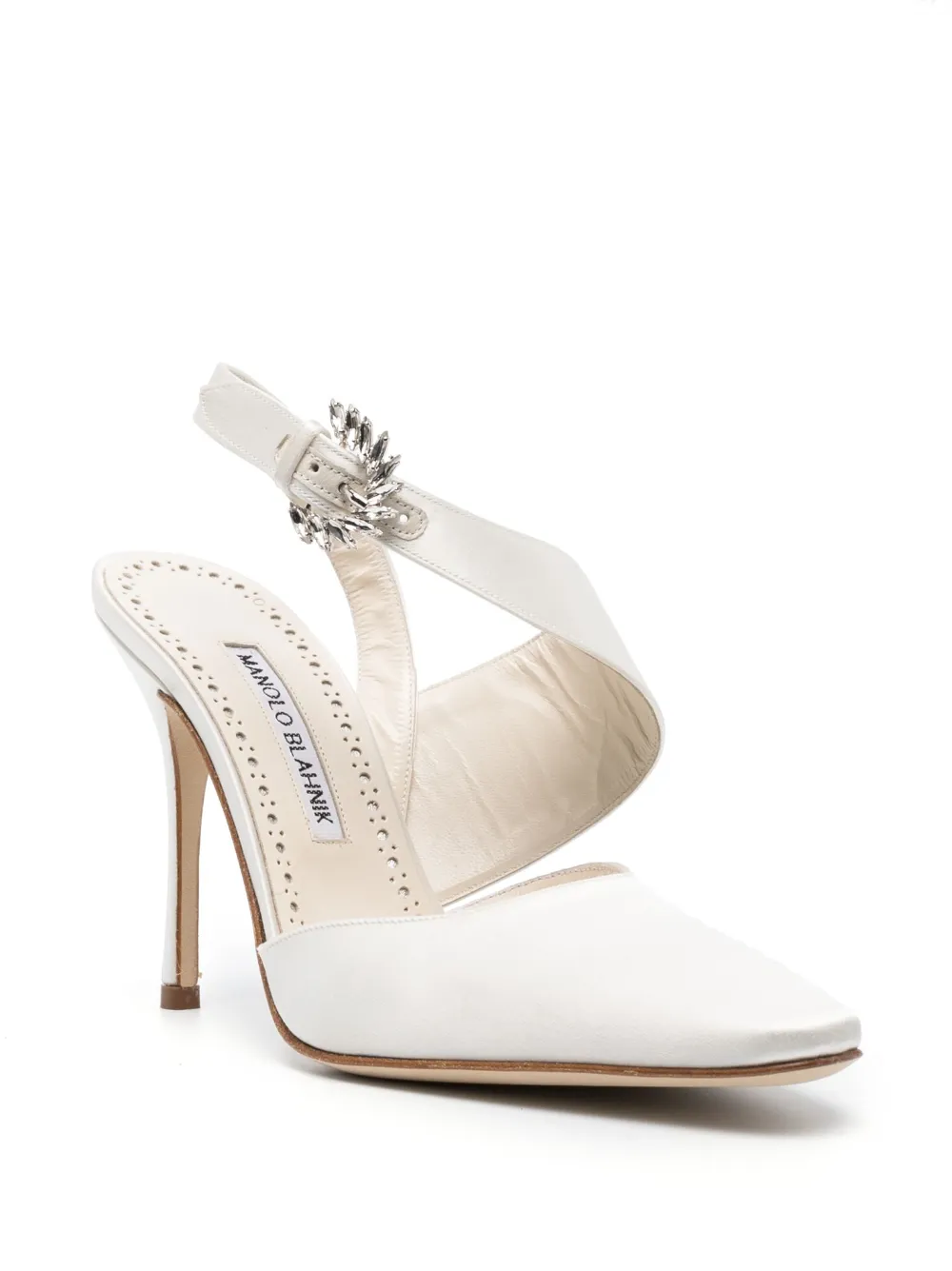 Manolo Blahnik is known for presenting elegant footwear and accessories. The label welcomes these Hafela pumps for an eye-catching and daring look, thanks to asymmetrical strap, finished with ornate fern embellishment.