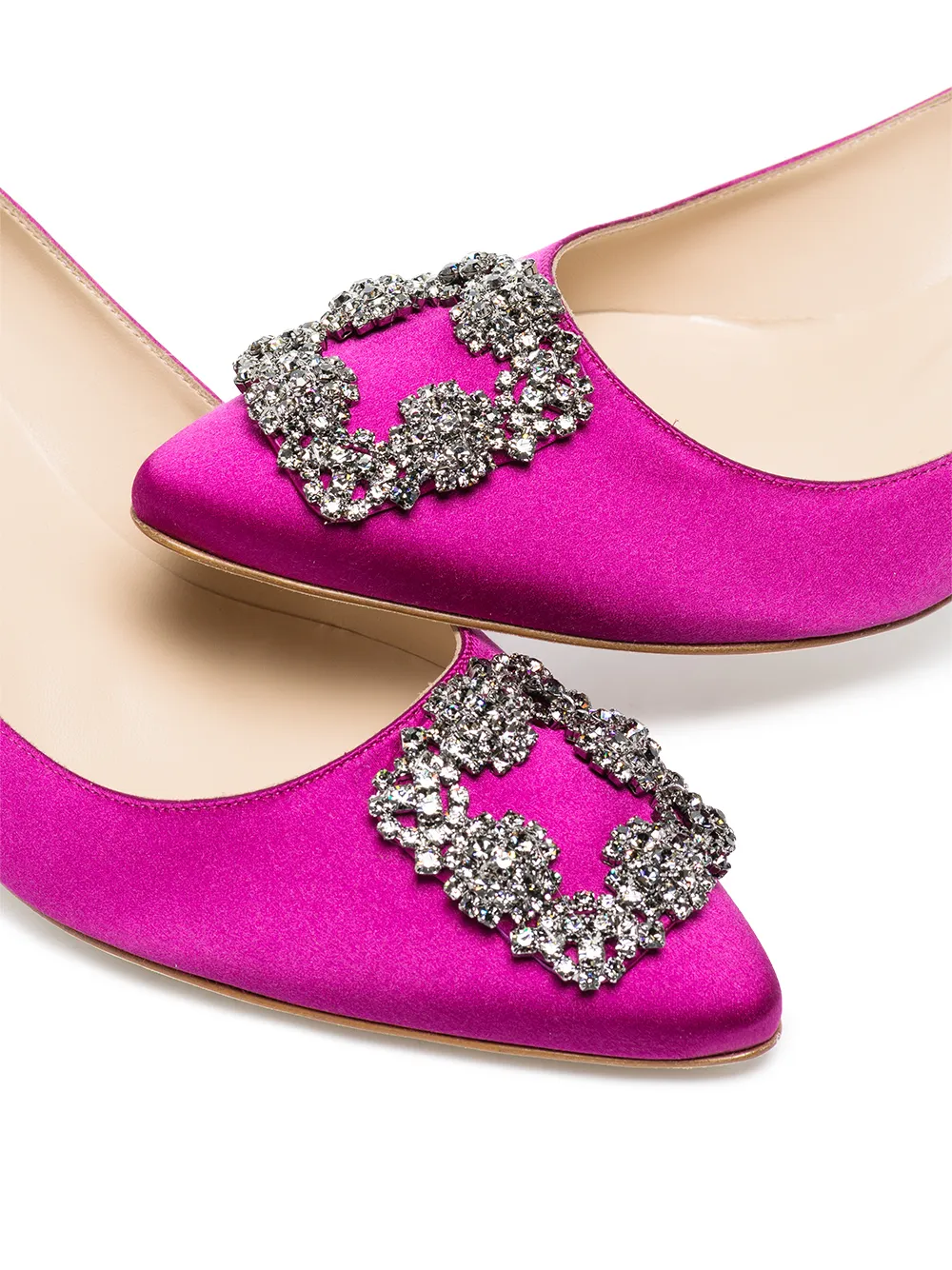 One of the house’s common coveted silhouettes, the Hangisi shoes boast a sharp pointed toe that’s softened with glistening crystal embellishments and a satin finish. Part of Manolo Blahnik’s SS22 collection, they’re designed in a bright fuchsia colour.