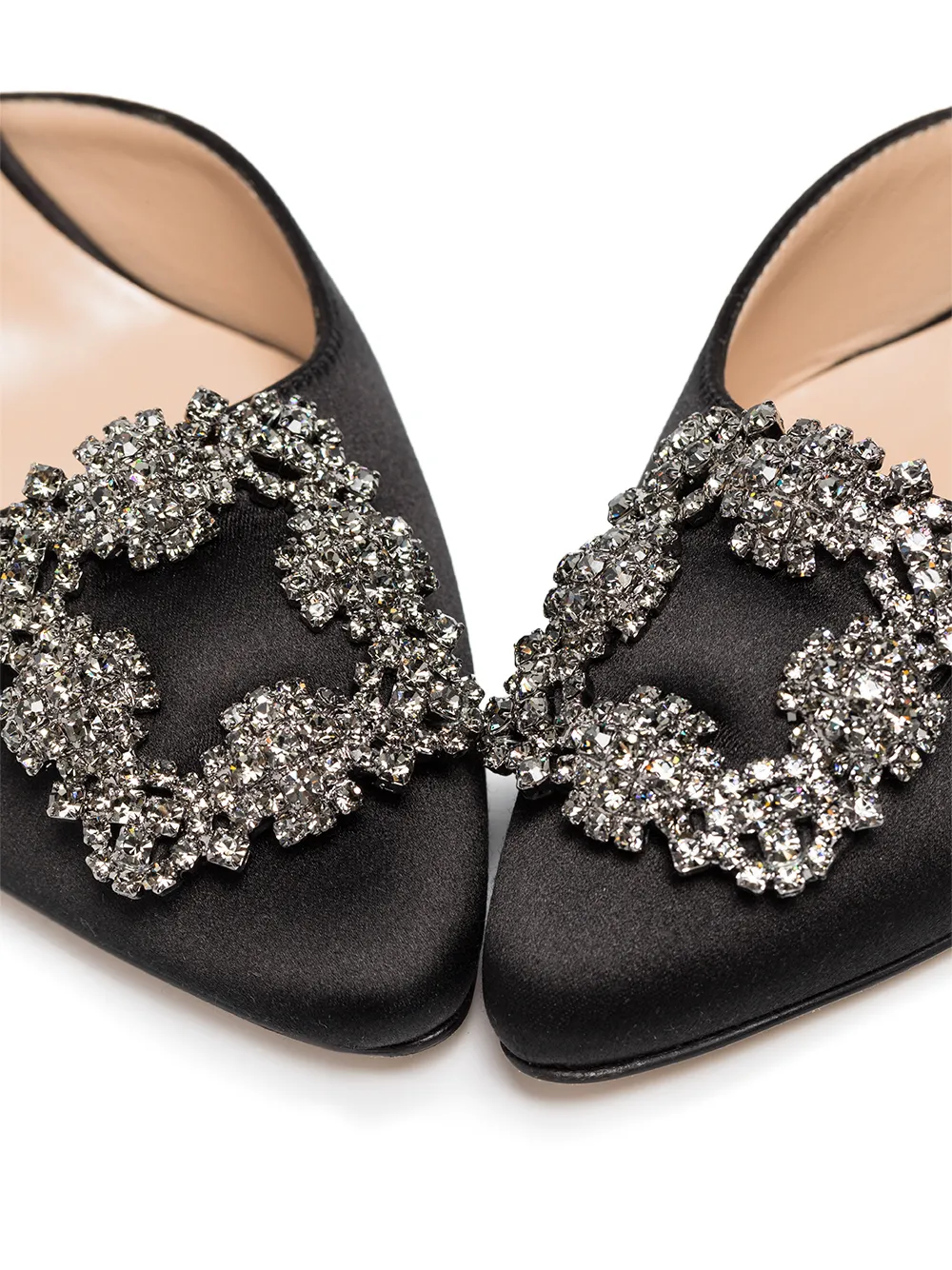 Manolo Blahnik reworks the cult Hangisi style in a slingback silhouette. Resting on a 70mm heel, this black satin pair is topped with the brand’s signature crystal buckle.