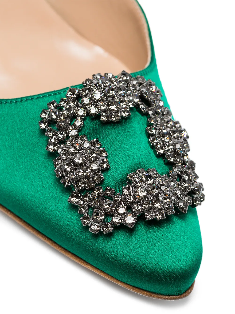 These green Manolo Blahnik Hangisi 70 slingback satin pumps are crafted in Italy. They feature pointed toes, 70 mm heels, leather soles, crystal buckles and elasticated slingback straps. Yes that’s right, just call us twinkletoes in our Manolo Blahnik pumps.