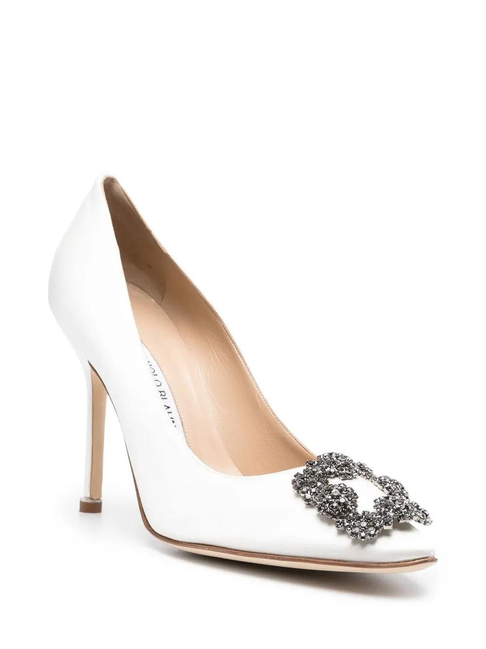 Hangisi 90mm pumps from MANOLO BLAHNIK featuring white, calf leather, silk satin, crystal buckle detail, slip-on style, pointed toe, branded insole and high heel.