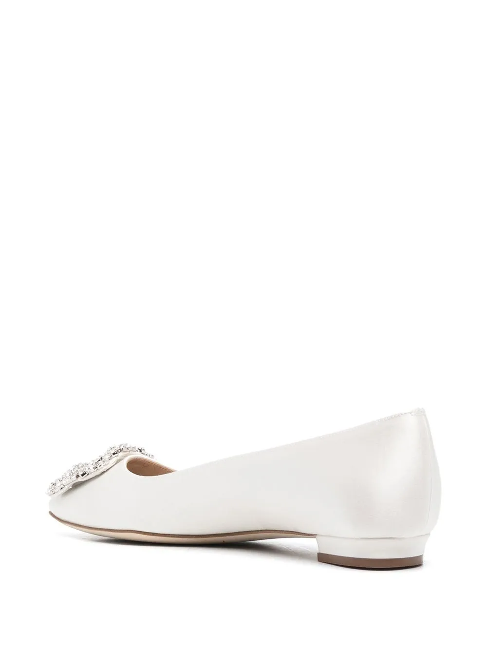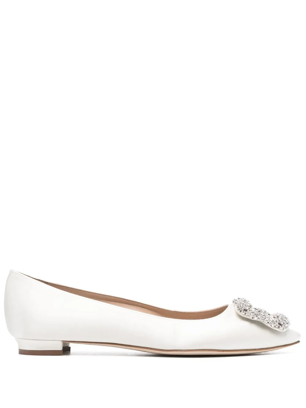 Hangisi crystal embellished ballerinas from MANOLO BLAHNIK featuring light beige, calf leather, metallic sheen, crystal embellishment, pointed toe, branded insole and flat sole.