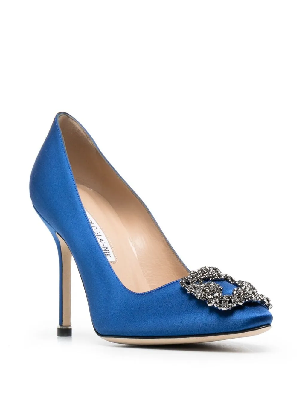 Blue leather Hangisi jewel-buckle pumps from MANOLO BLAHNIK featuring crystal buckle detail, pointed toe, slip-on style, high heel and branded insole.