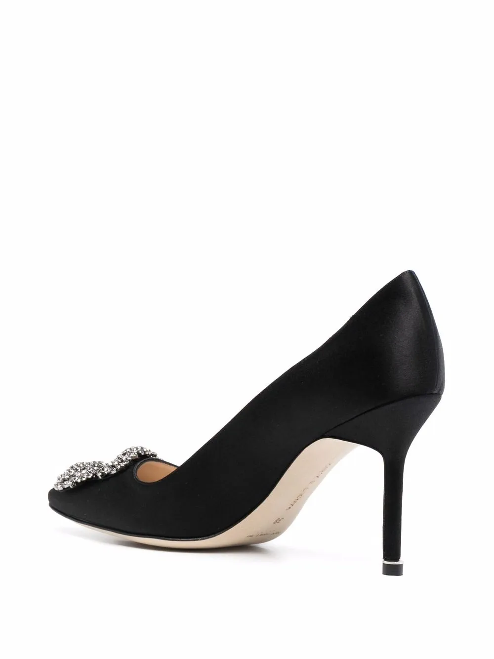 Black velvet Hangisi pointed pumps from MANOLO BLAHNIK featuring velvet effect, buckle detail at the toe, pointed toe, branded leather insole and high heel.