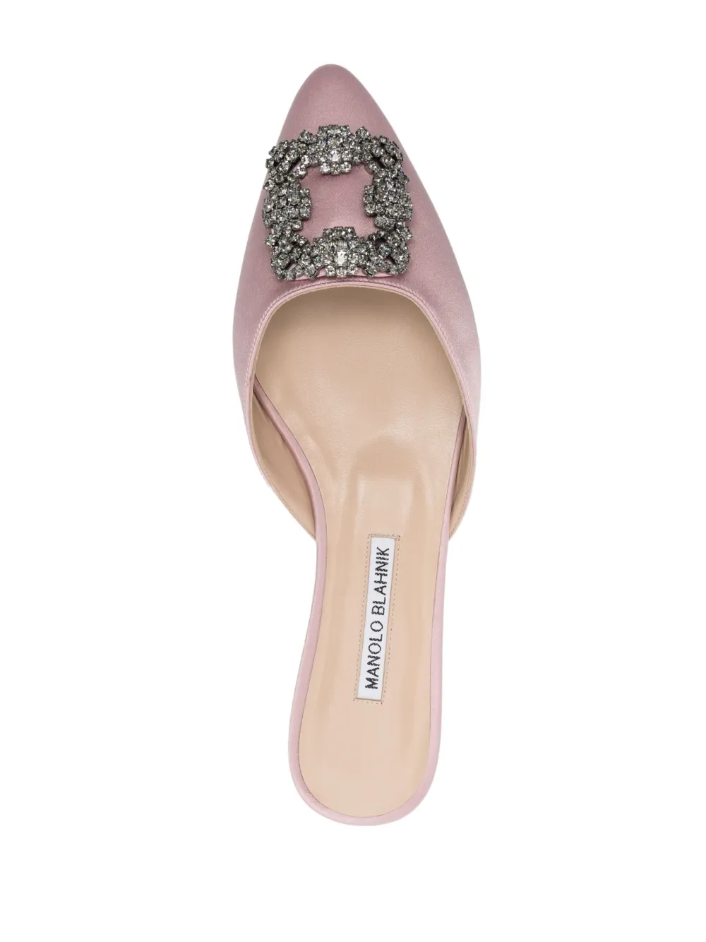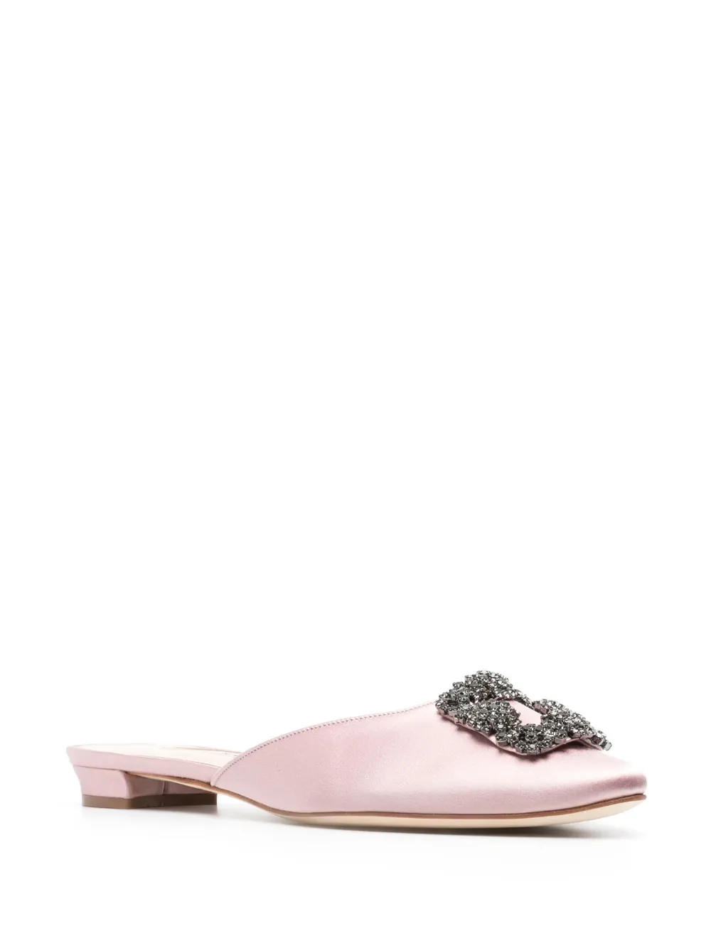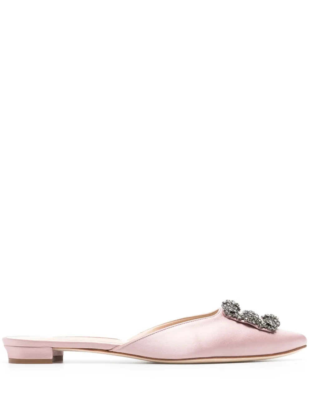 Hangisimuflat crystal-buckle satin-finish mules from MANOLO BLAHNIK featuring blush pink, calf leather, satin finish, crystal buckle detail, pointed toe, slip-on style, branded leather insole and flat leather sole.
