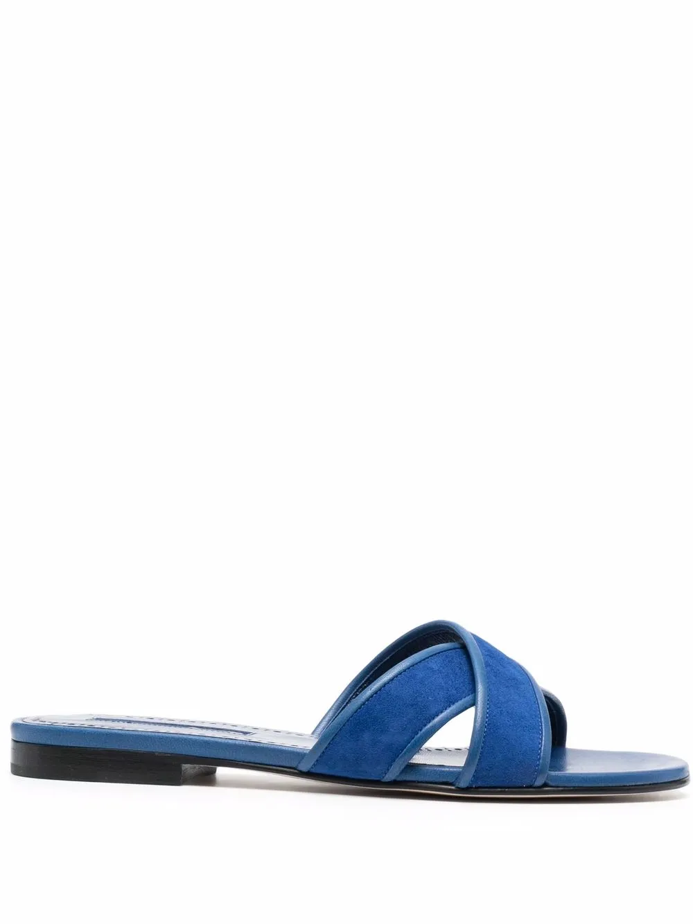 Blue leather/suede Ifneta sandals from MANOLO BLAHNIK featuring crossover strap at the toe, open toe, branded insole and flat sole.