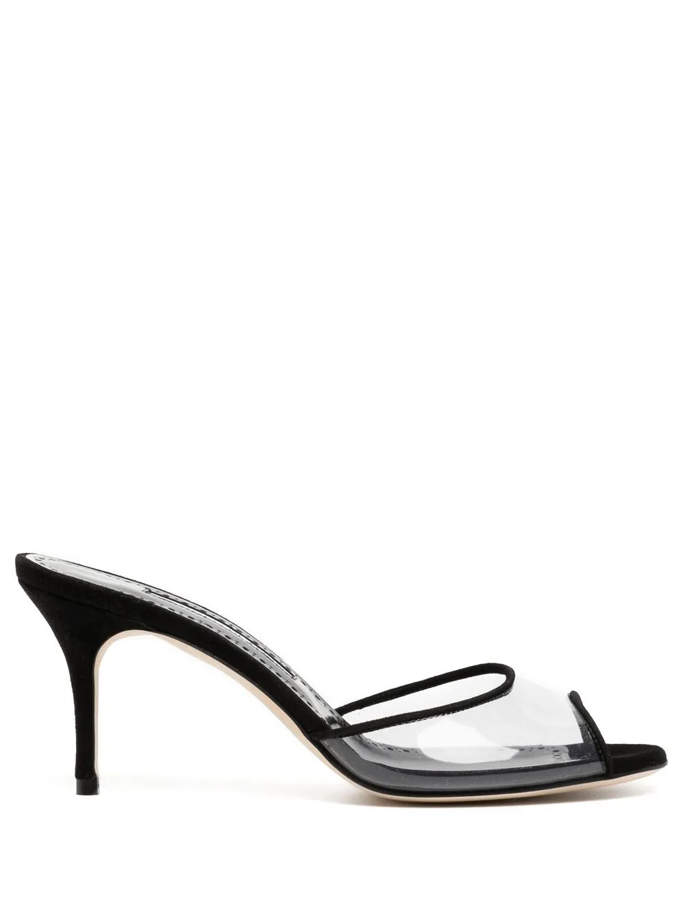 Jadifa transparent heeled 70mm mules from MANOLO BLAHNIK featuring black, transparent strap, open toe, open back, slip-on style, high stiletto heel and branded leather insole.