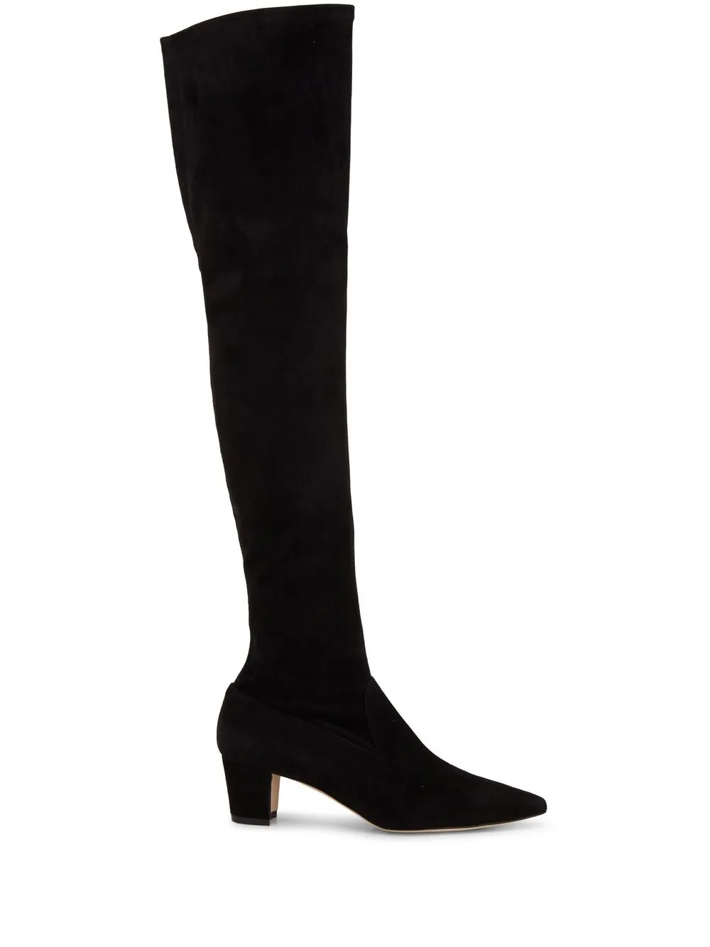 knee-length pointed boots from MANOLO BLAHNIK featuring black, leather, suede, knee-length, pointed toe and low block heel.
