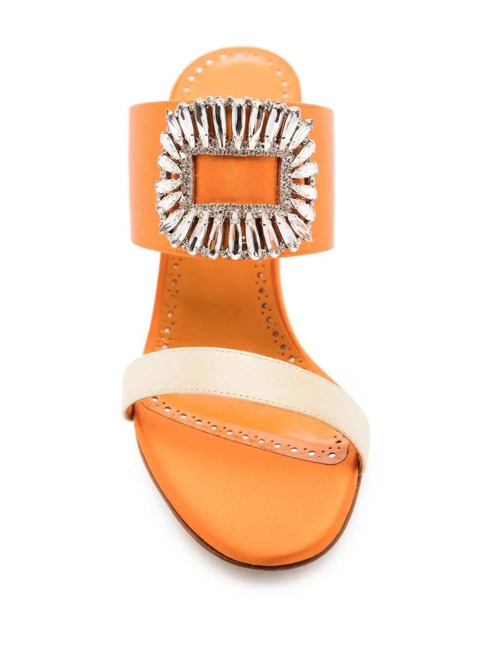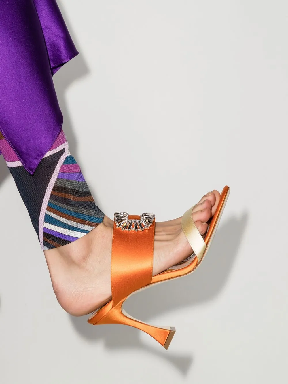 Laali 105mm crystal-embellished sandals from MANOLO BLAHNIK featuring orange, leather, satin finish, crystal buckle detail, open toe, branded insole, slip-on style, backless and high sculpted heel.