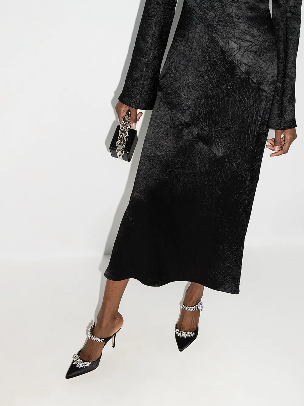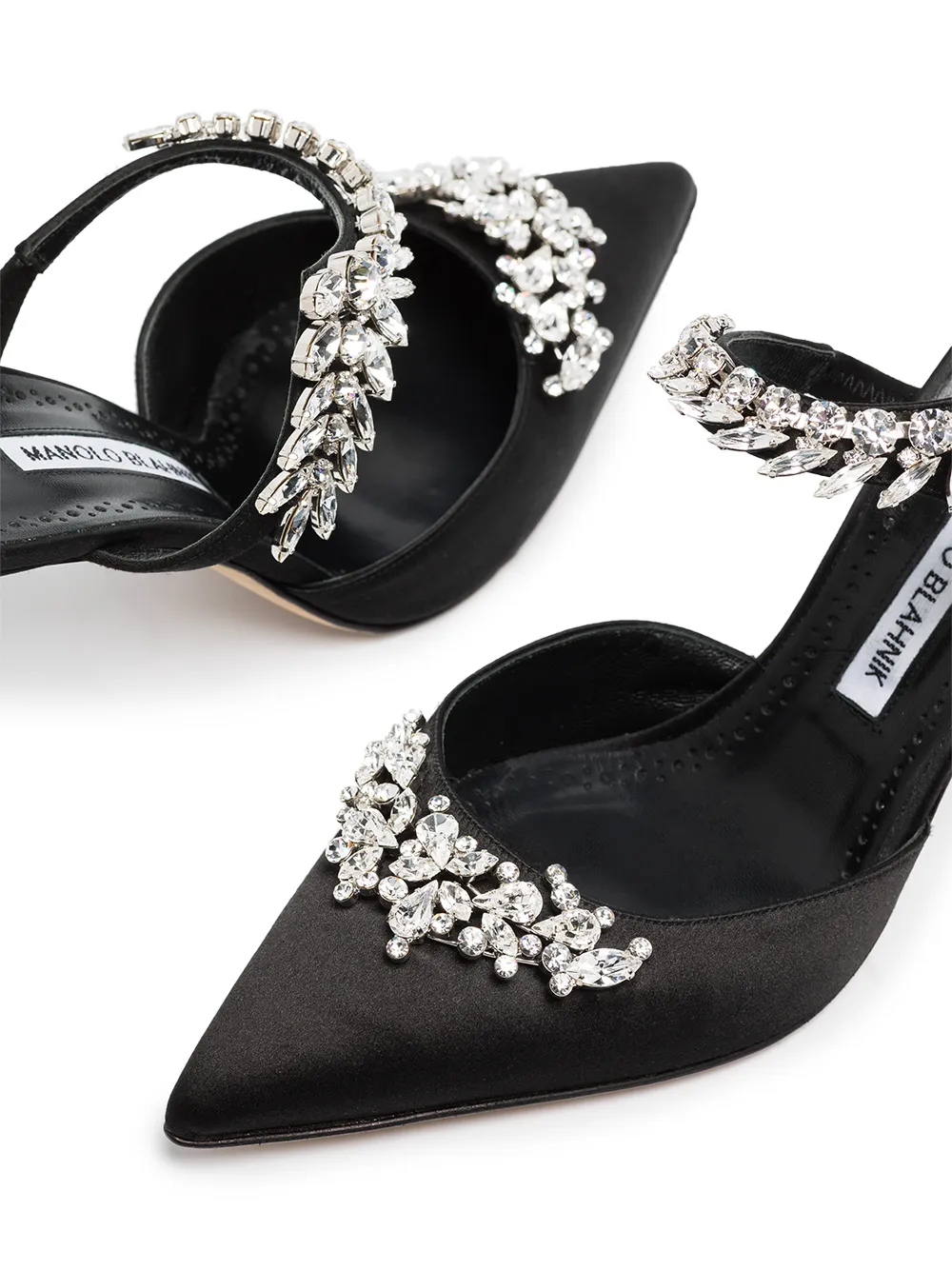 These black Manolo Blahnik Lurum 90 satin mules are crafted in Italy and have a pointed toe and leather linings and soles. Set on a 90 mm stiletto heel, they feature crystal embellishments at the vamp and along the fixed strap that sits over the arch and is fitted with side elastication. These shoes remind us of something Ella Woodward once said: ‘When life gives you Monday, dip it in glitter and sparkle all day.’ Works for us – we’re happy to dip our toes into these Manolo Blahnik heels all day, every day.