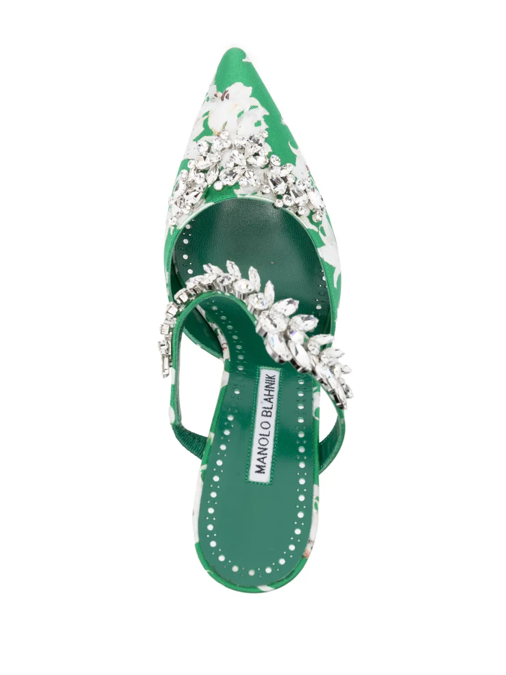 Manolo Blahnik’s SS23 collection finely demonstrates the brand’s glamorous aesthetic. Part of the range, the Lurum mules are a case in point: they’re crafted from green silk and decorated with the white Casa Blanca Lily print and a crystal-embellished strap.