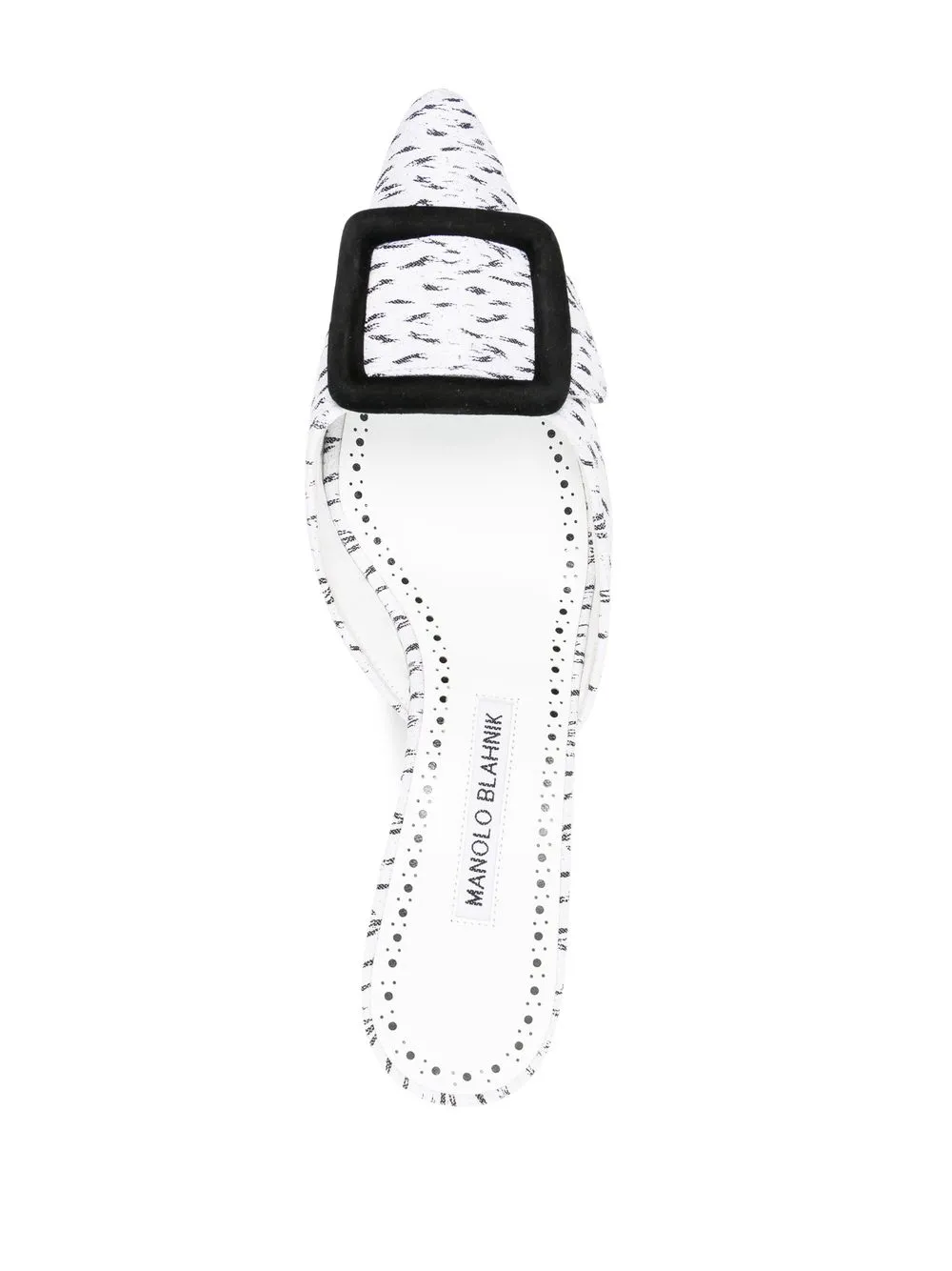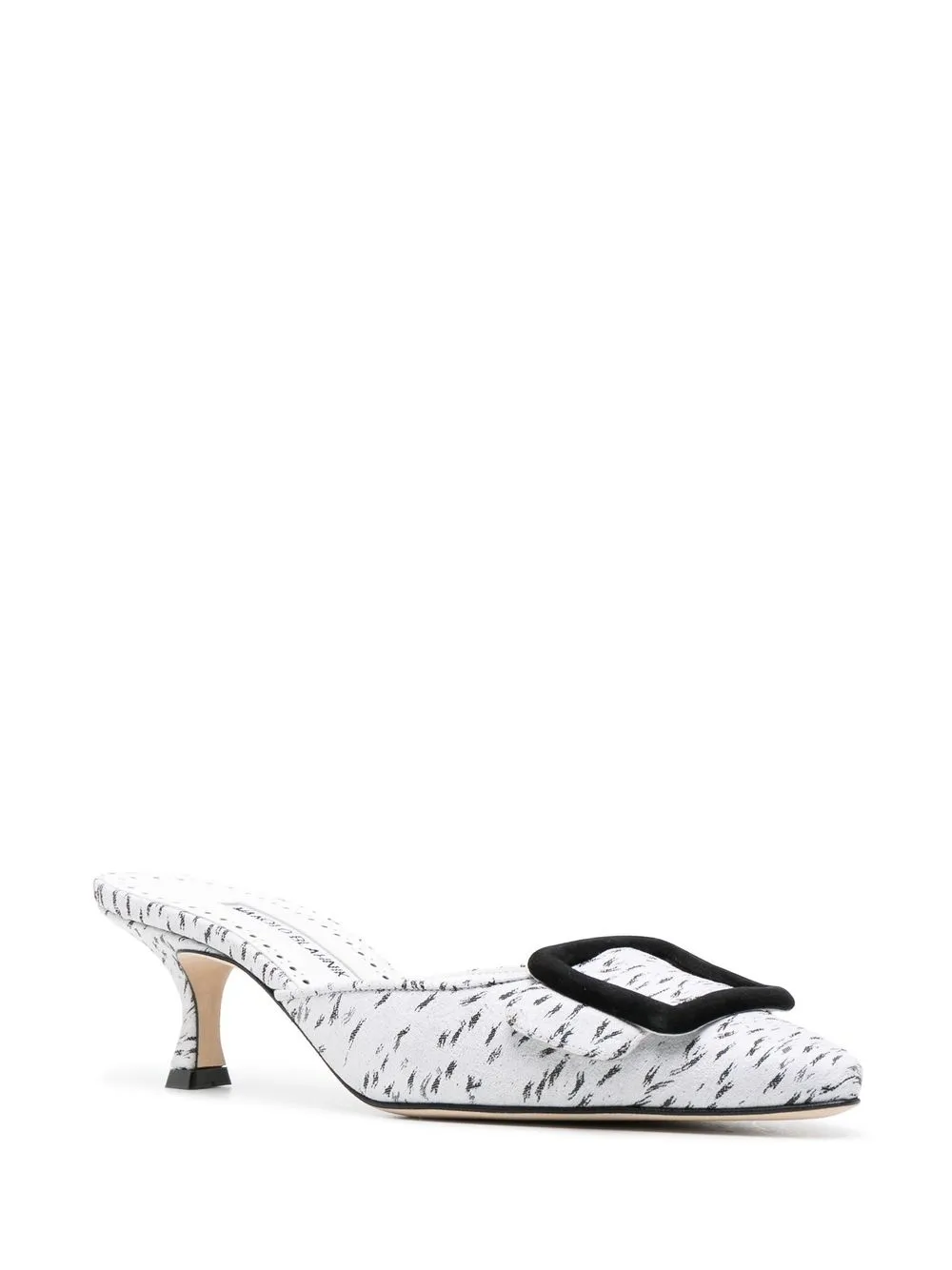 Crafted from smooth calf leather in Italy, this white iteration of the Maysale mules is punctuated with printed black accents throughout whilst a tonal buckle adds a sophisticated appeal at the pointed toe.