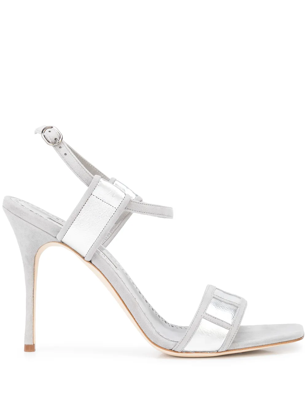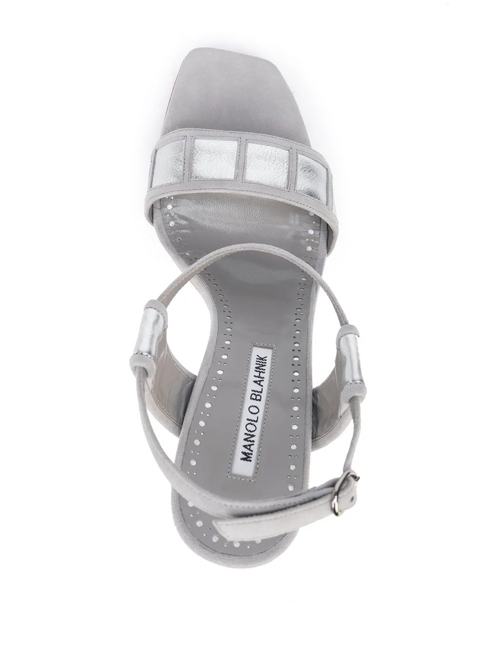 Light grey metallic-effect leather sandals from MANOLO BLAHNIK featuring leather lining, open toe, single toe strap, buckle-fastening ankle strap, branded insole and high heel.