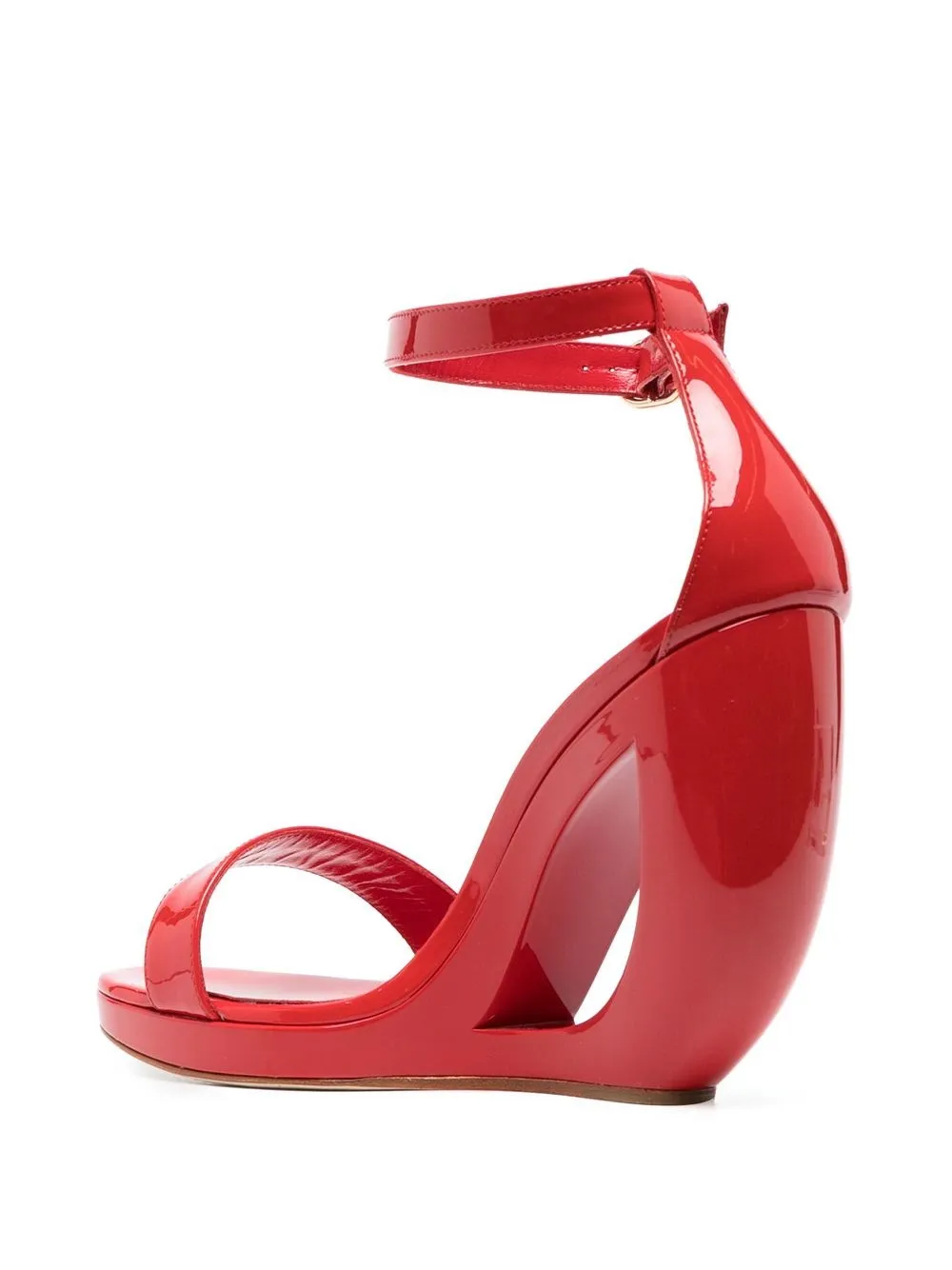 Boasting an art deco-inspired silhouette, as shown by their curved wedge heel, these red Rocar sandals are made in Italy from smooth calf leather whilst seamlessly evoking Manolo Blahnik’s penchant for statement footwear.