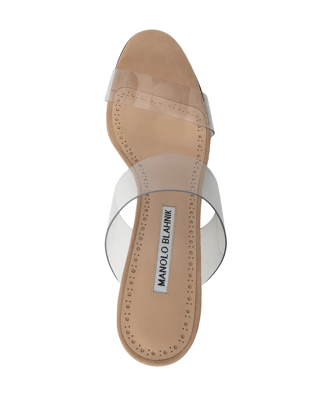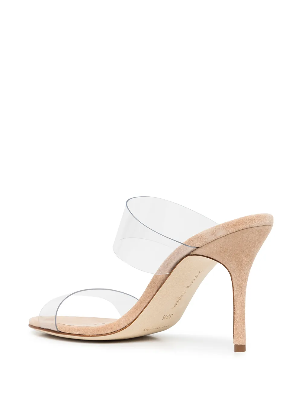 Beige leather Scolto 90mm slip-on sandals from MANOLO BLAHNIK featuring open toe, slip-on style, high heel and clear straps.