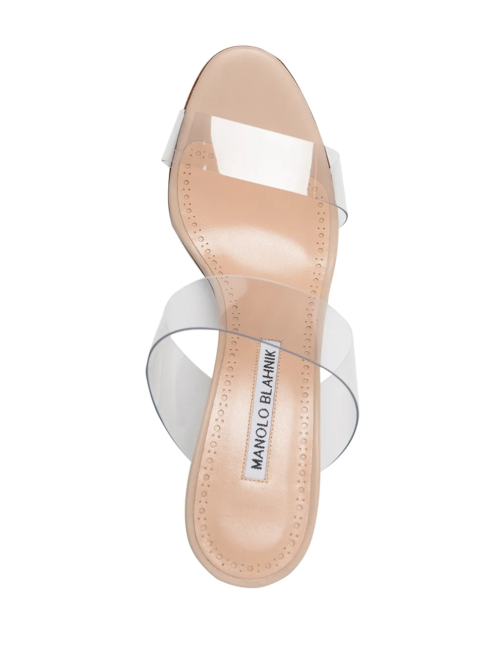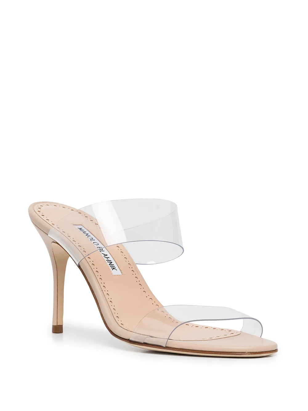 Nude leather Scolto 90mm transparent mules from MANOLO BLAHNIK featuring transparent design, slip-on style, open toe, branded insole and high heel.