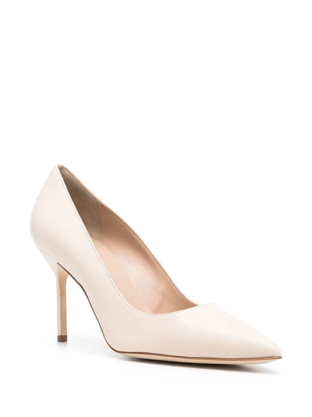 Tora 90mm leather pumps from MANOLO BLAHNIK featuring beige, calf leather, leather lining, branded insole, pointed toe, slip-on style and stiletto heel.